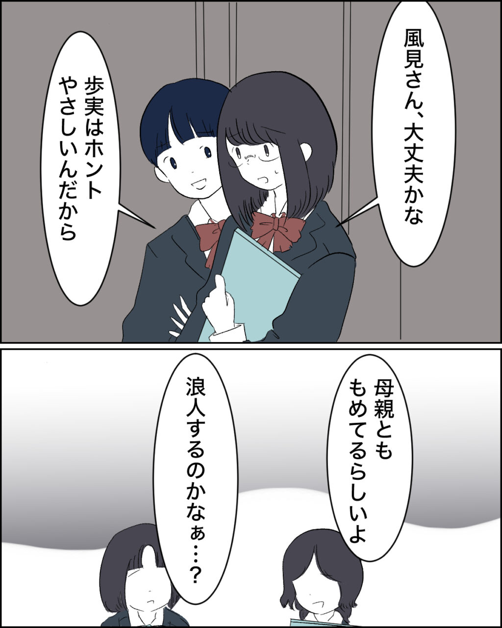 いじめられていたにも関わらず、風見さんの状況を知り「風見さん、大丈夫かな」と心配する歩実にカナちゃんが「歩実はホントやさしいんだから」と少し呆れたように言い、他の友達は「母親とももめてるらしいよ」「浪人するのかなぁ・・?」と風見さんについて話していました。