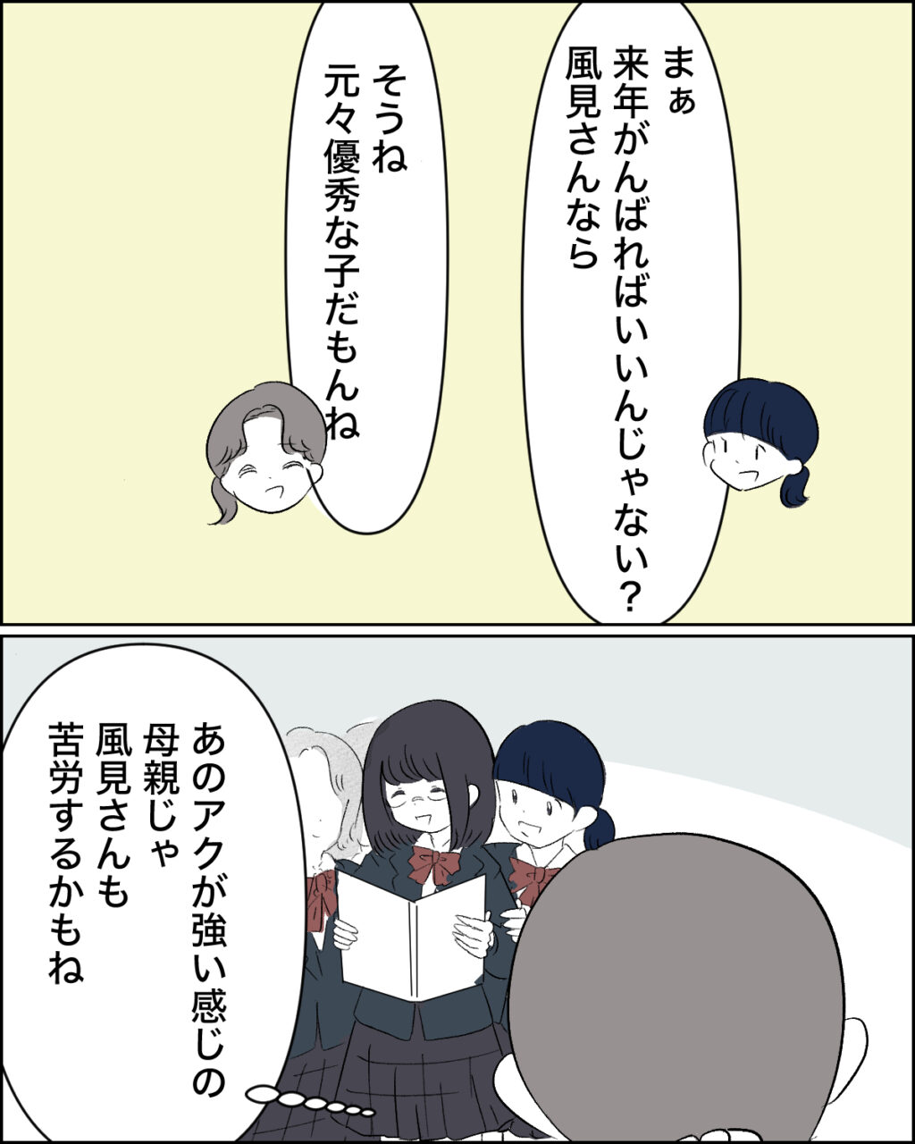 「まぁ、来年がんばればいいんじゃない?風見さんなら」とカナちゃんが言うのを聞いた私は、「そうね。もともと優秀な子だもんね」と言いながら、中学のときの話し合いで見た風見さんの母親の態度を思い出して「あのアクが強い感じの母親じゃ風見さんも苦労するかもね」とほんの少しだけ風見さんに同情しました。
