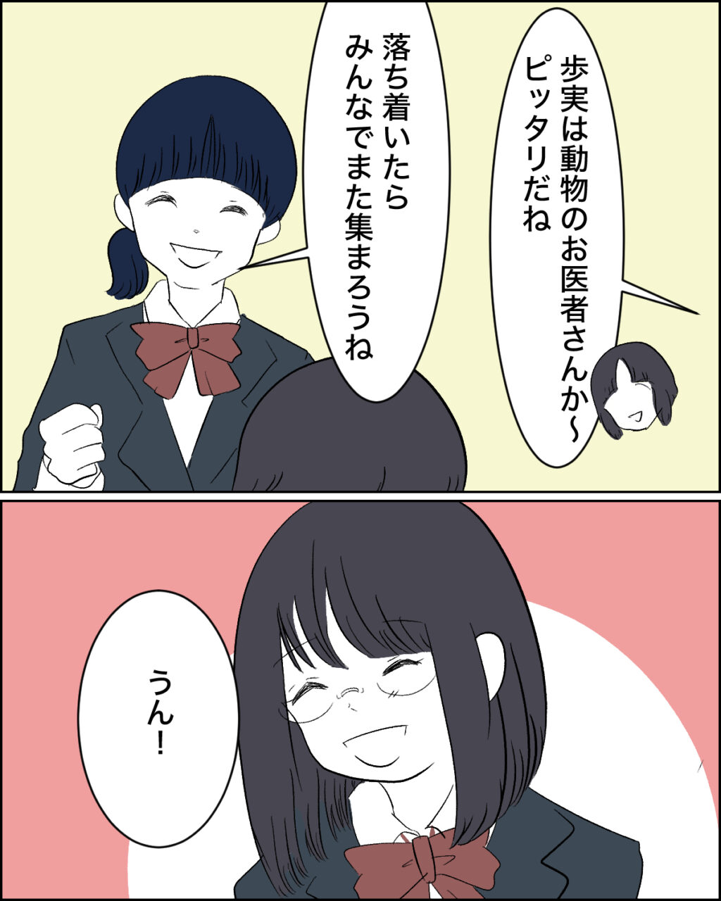 「歩実は動物のお医者さんか~。ピッタリだね」「落ち着いたらみんなでまた集まろうね」と声をかけられた歩実は「うん!」と満面の笑みで答えていました。