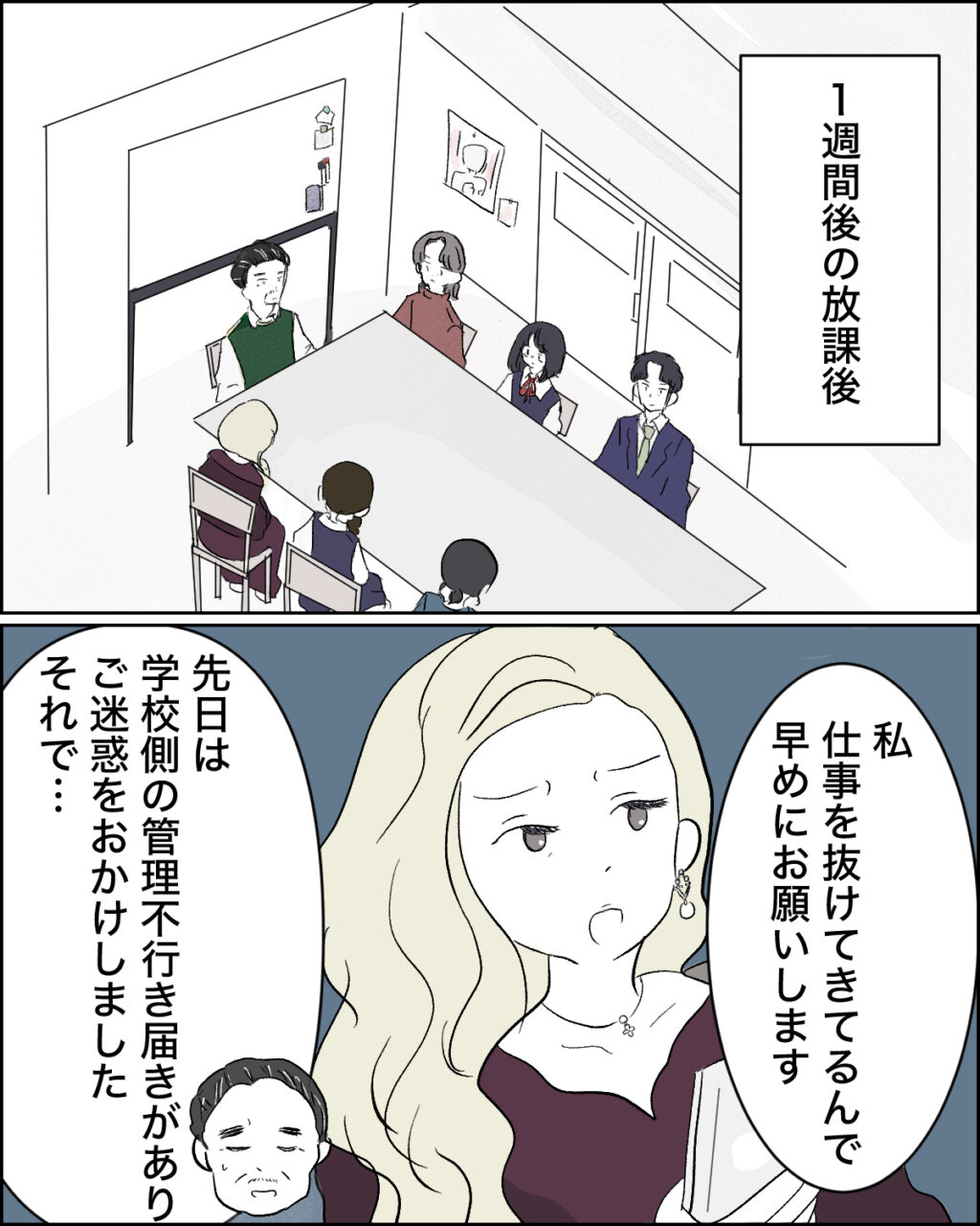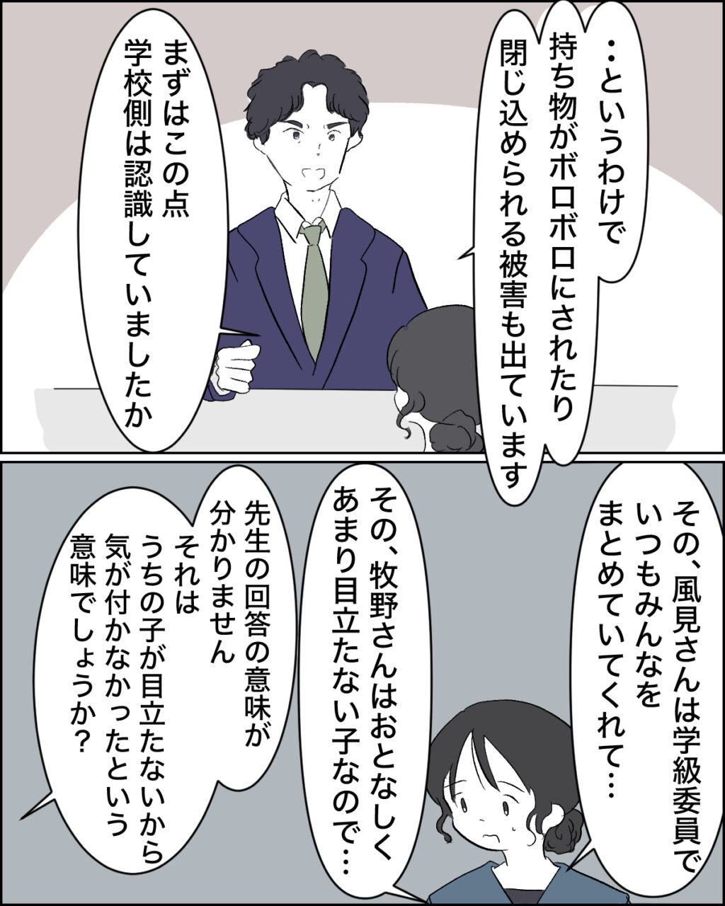 それから1週間後の話し合い当日。私たち家族は中学校の応接室へ案内されました。そこには風見さん親子、担任の水原先生、そして学年主任の先生が顔を揃えています。風見さんのお母さんは「私、仕事を抜けてきてるんで早めにお願いします」と露骨に面倒そうな態度。そんな重々しい雰囲気のなか、学年主任の先生が口を開きました。「先日は学校側の管理不行き届きがありご迷惑をおかけしました、それで・・・」