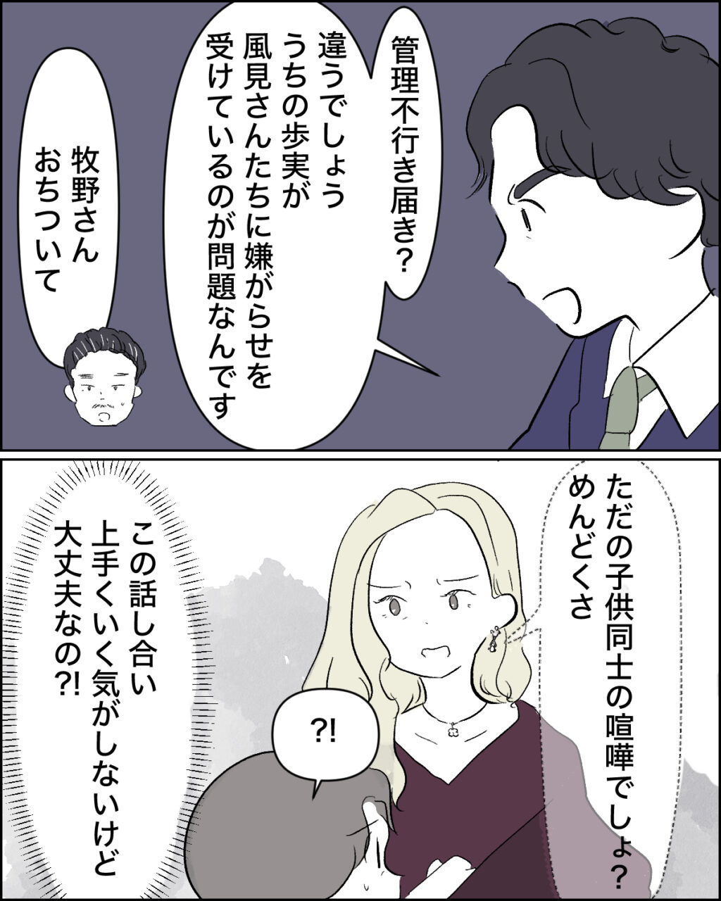 先生のいじめを濁すような言い方が気に障ったのか「管理不行き届き?違うでしょう、うちの歩実が風見さんたちに嫌がらせを受けているのが問題なんです」とハッキリ告げる博之。すると風見さんのお母さんが「ただの子ども同士の喧嘩でしょ?めんどくさ」と小さく吐き捨てるようにつぶやきました。私はその様子を見て、この話し合い上手くいくのかな・・・と不安な気持ちになります。