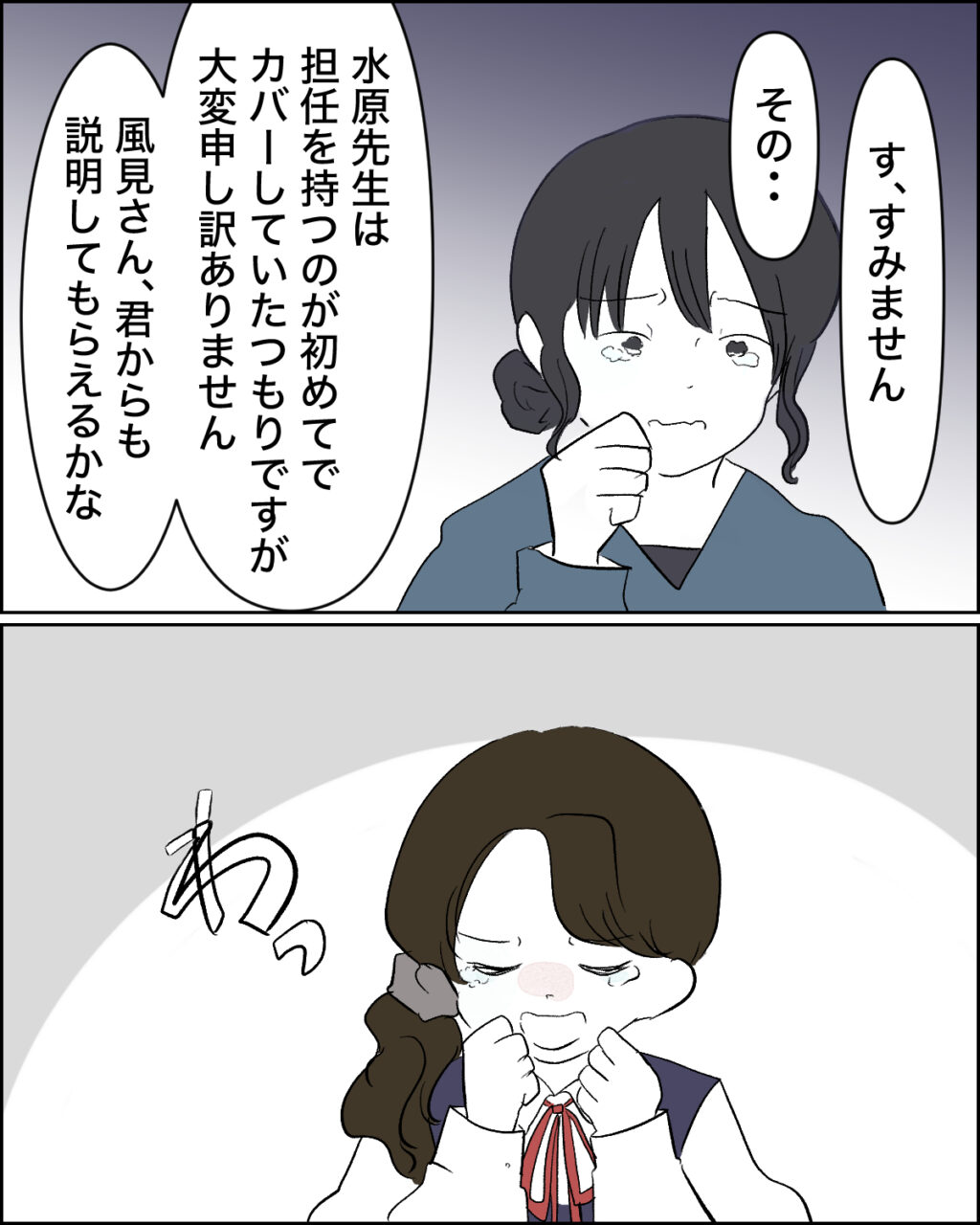 「す、すみません」と泣き出す水原先生。空気がさらに重くなる中、学年主任の先生が慌ててフォローに入り、「水原先生は担任を持つのが初めてで・・・申し訳ありません」と頭を下げます。そして視線を風見さんへ移すと、「風見さん、君からも説明してもらえるかな」と促しました。すると風見さんも、わっと声を上げて泣き出してしまいました。