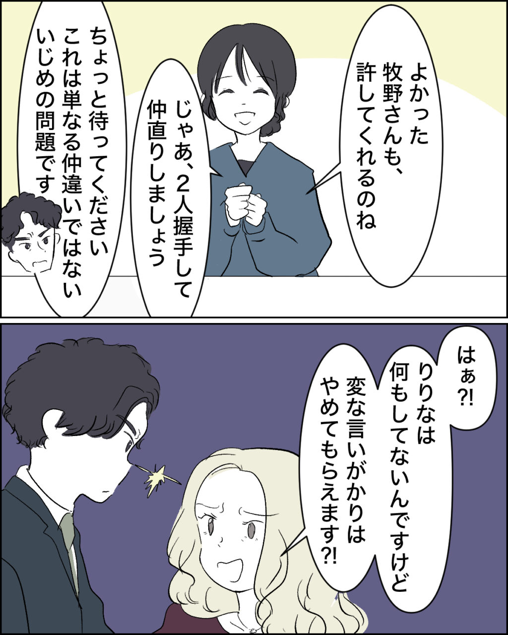 「よかった。牧野さんっも許してくれるのね。じゃあ2人握手して仲直りしましょう」水原先生が笑顔でそう言うと、「ちょっと待ってください。これは単なる仲違いではない。いじめの問題です」博之がそう言って話を遮ると、「はぁ!?りりなは何もしてないんですけど。変な言いがかりはやめてもらえます!?」と風見さんのお母さんが強い口調で言いました。