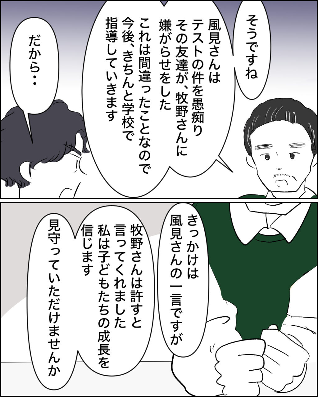 「そうですね。風見さんはテストの件を愚痴り、その友達が牧野さんに嫌がらせをした。これは間違ったことなで今後、きちんと学校で指導していきます」学年主任の先生はそう言うと、「きっかけは風見さんの一言ですが、牧野さんは許すと言ってくれました。私は子ども達の成長を信じます。見守っていただけませんか」と私たちに呼びかけるように言いました。