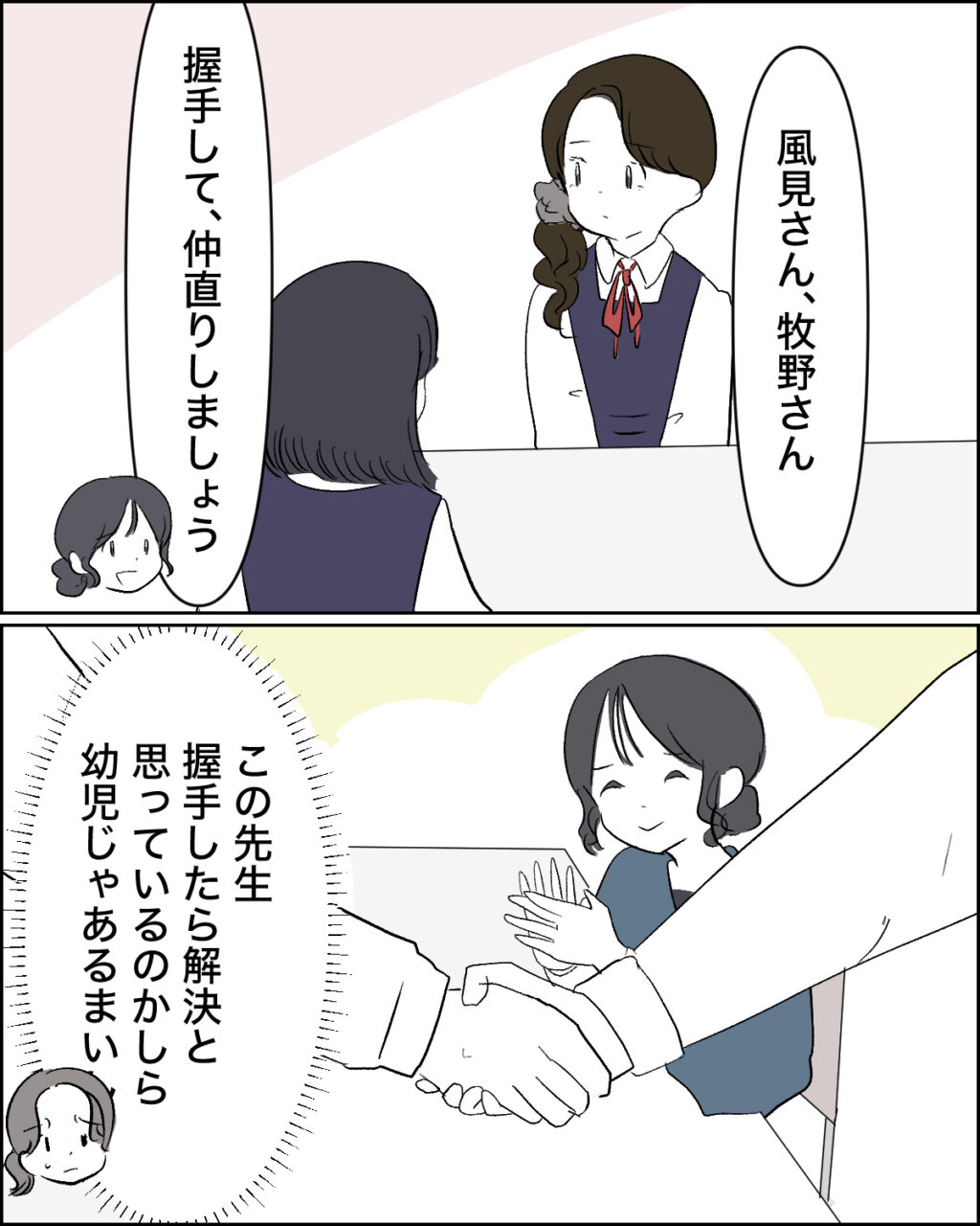 すると、「風見さん、牧野さん、握手して仲直りしましょう」と言い出す水原先生の言葉に、「この先生、握手したら解決だと思っているのかしら・・幼児じゃなるまいし」と心の中で呟きました。