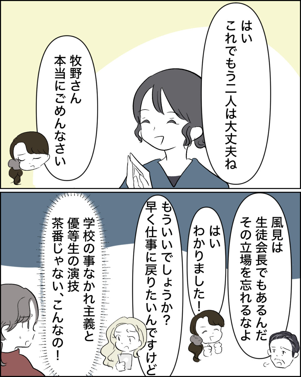 「はい。これでもう2人は大丈夫ね」水原先生がそう言うと、「牧野さん、本当にごめんなさい」と水原先生の隣で謝る風見さんに、「風見は生徒会長でもあるんだ。そのア立場を忘れるなよ」学年主任の先生が言うと、「はい、わかりました!」と元気いっぱいに挨拶しました。そのやりとりを見た風見さんの母さんは、もういいでしょうか?早く仕事に戻りたいんですけど」としかめっ面で言う風見さんのお母さん、その様子を見て「学校の事勿れ主義と優等生の演技、茶番じゃないこんなの!」今回の話し合いは私たちにとって、何も意味がないことがわかりました。